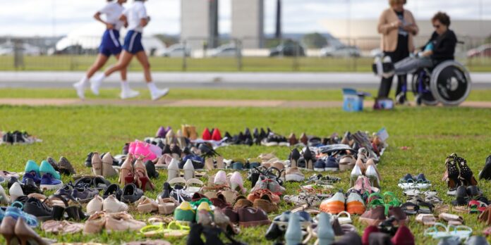 Cerca de 950 pares de sapatos usados foram colocados no gramado da Esplanada dos Ministérios, próximo ao Ministério da Saúde, em Brasília, na manhã desta terça-feira (13) no ato público que marca o Dia Nacional de Conscientização e Enfrentamento da Encefalomielite Miálgica (EM), conhecida como Síndrome da Fadiga Crônica (EM/SFC), em 12 de maio e, também, o mês dedicado à doença neurológica.
