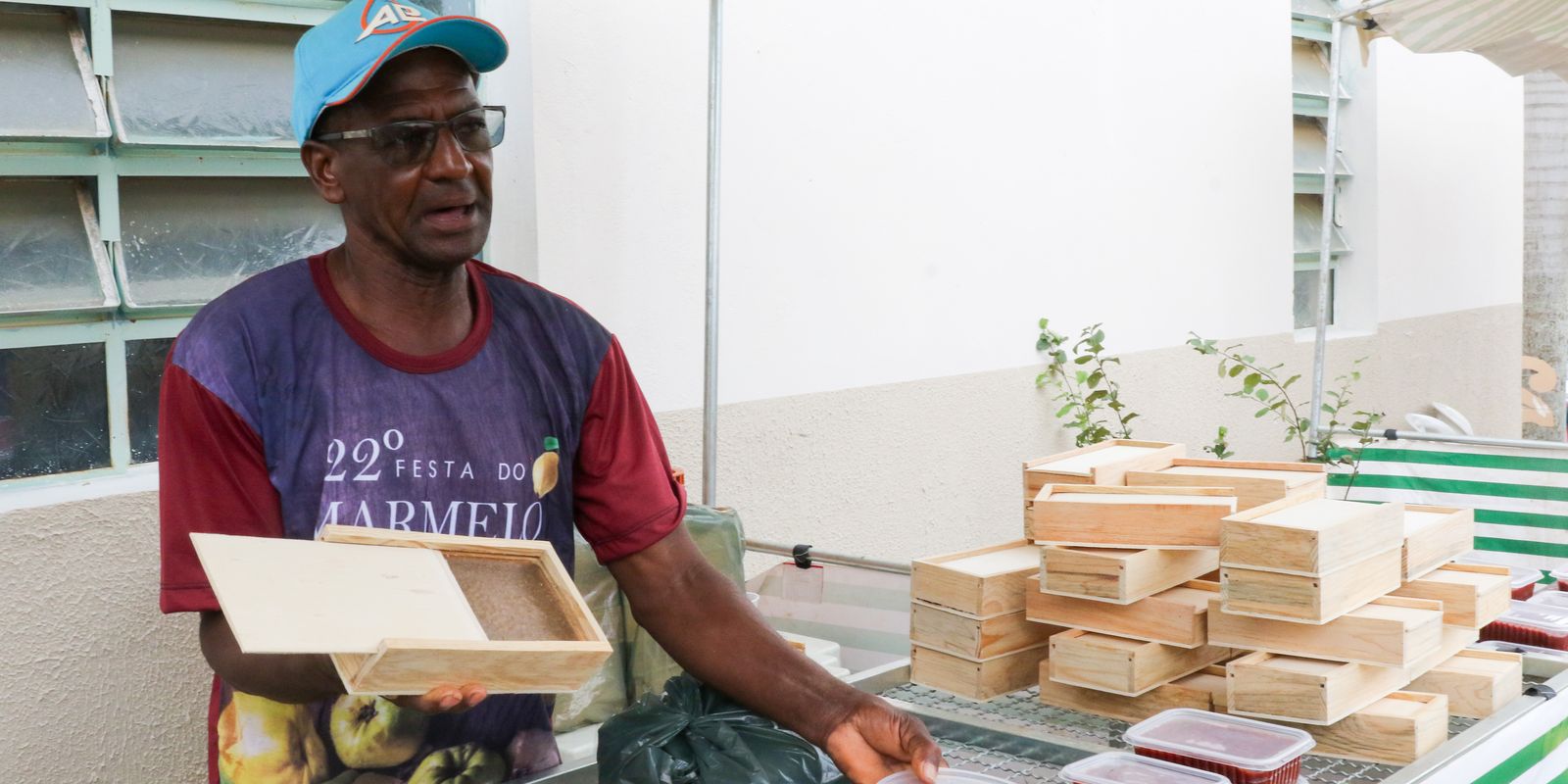 “Essa cultura vem de antes dos meus bisavôs, que passaram para os meus avós, depois para os meus pais, que me ensinaram. Você faz tudo do marmelo, você pode comer ele inteiro, fazer sopa, fazer doce. É muito produtivo para tudo”, afirma Joselino Pereira Dutra, agricultor, diante de sua banca onde vende a marmelada. Além de fazer o doce, ele mesmo fabrica as simpáticas caixinhas de madeira onde a guloseima é armazenada e vendida. “Vem gente de muitos lugares, de Brasília, de Goiânia, Luziânia inteira. É uma festa muito tradicional”, comemora.