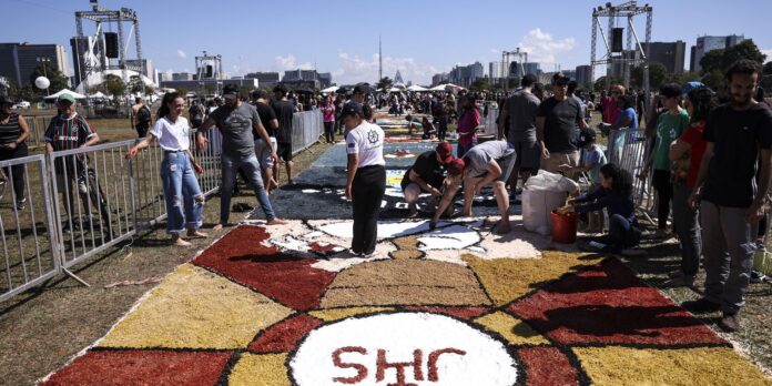 Conforme a arquidiocese, as atividades começaram por volta das 6h de hoje, com a montagem do tapete de 125 metros no gramado central. A montagem reuniu aproximadamente 600 pessoas integrantes de diversos movimentos, pastorais e serviços da arquidiocese.