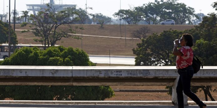 Brasília (DF), 03.09.2024 - Seca e alta temperatura em Brasília. Pessoa com garrafa de água passa pelo Setor de Diversões Sul.  Foto: Bruno Peres/Agência Brasil