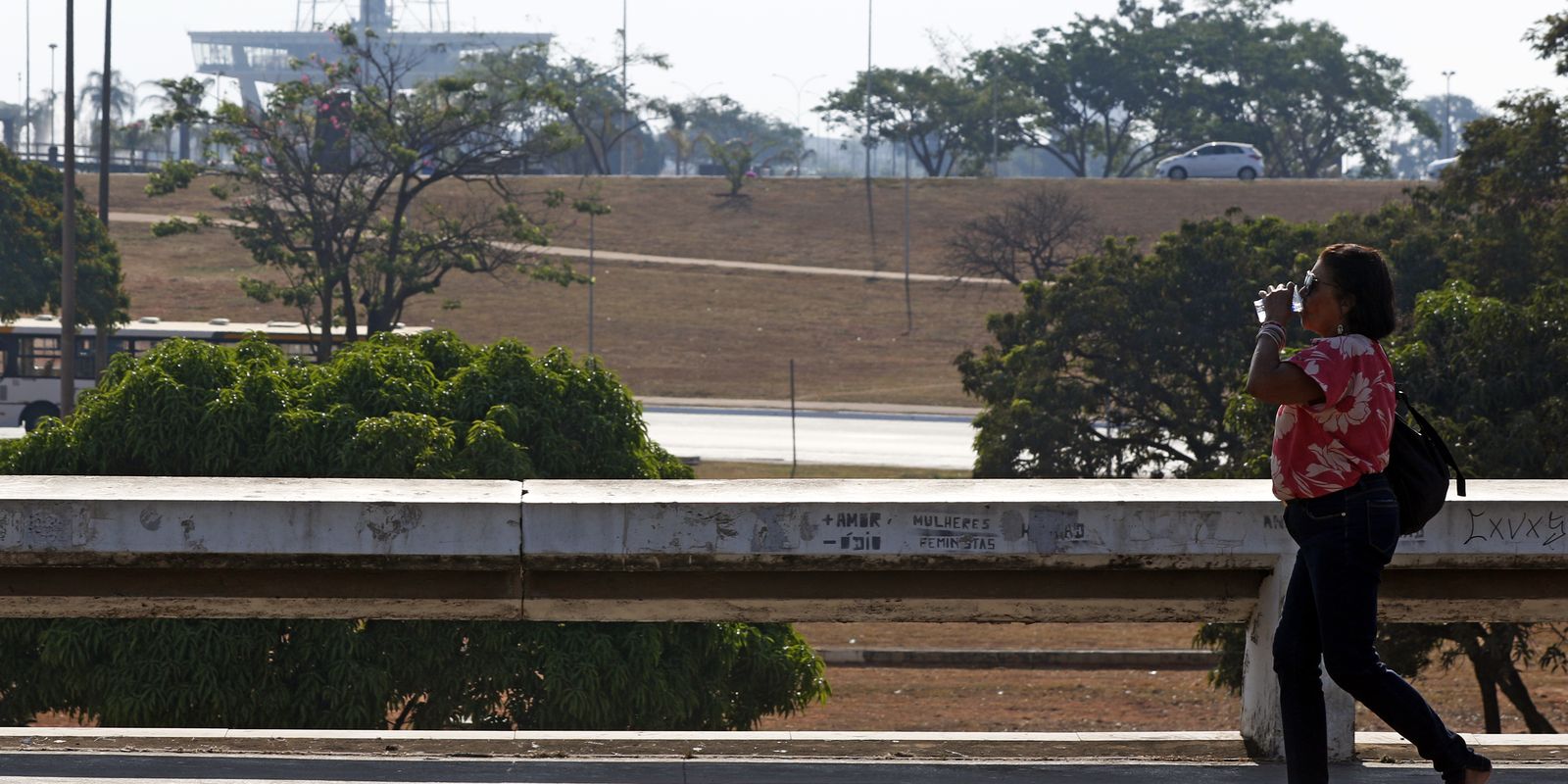 Seca e alta temperatura em Brasília. Pessoa com garrafa de água passa pelo Setor de Diversões Sul. Foto: Bruno Peres/Agência Brasil