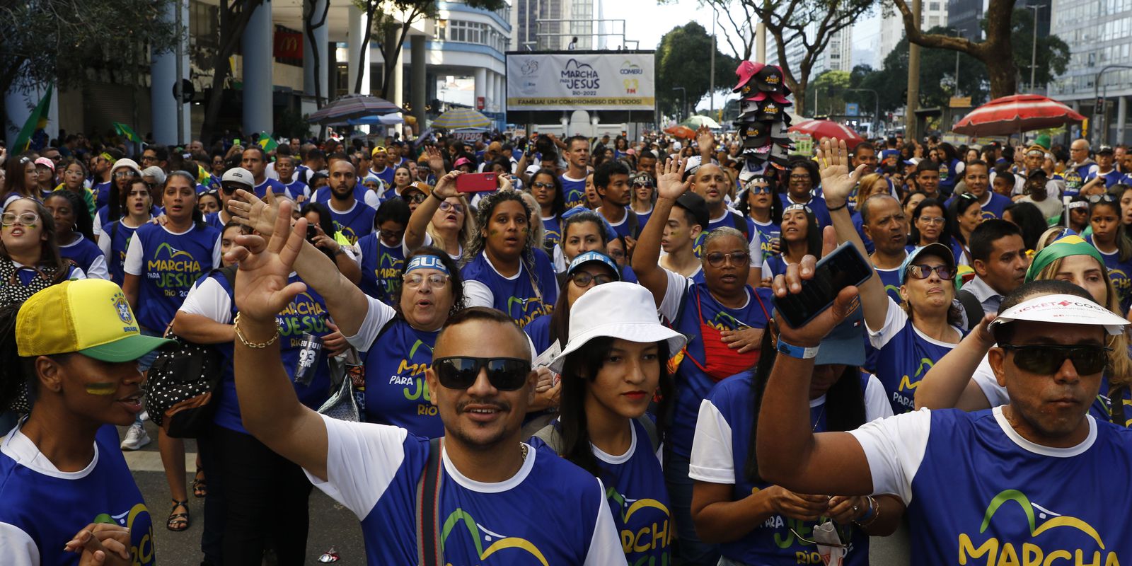 Em sua 15ª edição no Rio de Janeiro a Marcha para Jesus 2022 começou às 14h na Igreja da Candelária, na avenida Presidente Vargas, no centro da cidade. Em caminhada animada por seis trios elétricos, os fiéis seguiram para a Praça da apoteose, onde um palco recebe até de noite diversos cantores gospel e pastores.