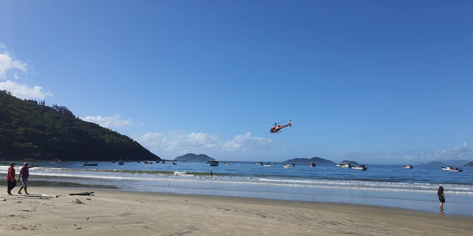 O helicóptero Arcanjo-01 foi acionado às 6h45 pela Central do Corpo de Bombeiros Militar de Santa Catarina para uma ocorrência de naufrágio de uma embarcação de pesca, com os tripulantes na água e em perigo. Uma embarcação do Grupo de Busca e Salvamento – GBS deslocou pela água e uma moto aquática com viatura por terra também.