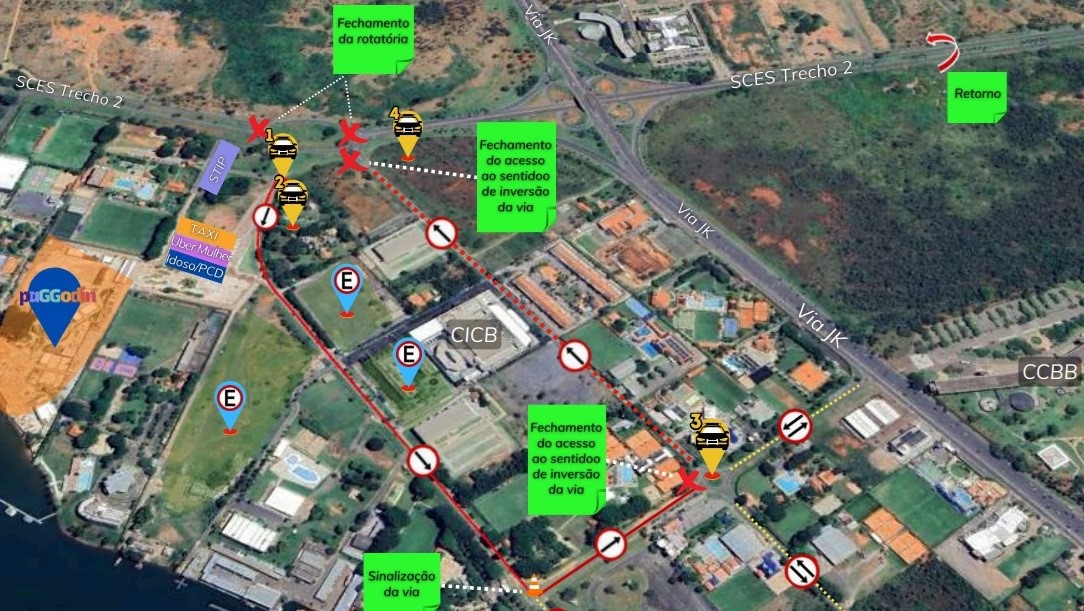 A partir das 23h, para facilitar a dispersão, o fluxo de veículos da rotatória próxima ao Clube dos Bombeiros seguirá em sentido único em direção à rotatória da SCES Trecho 3/2.