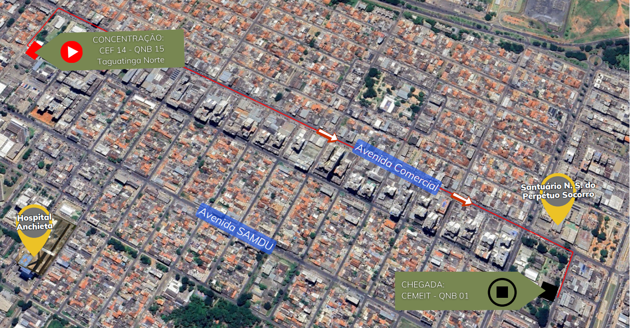 Os participantes sairão pela Avenida Comercial em direção centro de Taguatinga. Na altura do Santuário Nossa Senhora do Perpétuo Socorro, eles entrarão para o CEMEIT, local de chegada. Os agentes de trânsito farão o acompanhamento da caminhada, realizando as intervenções necessárias durante o deslocamento dos participantes.