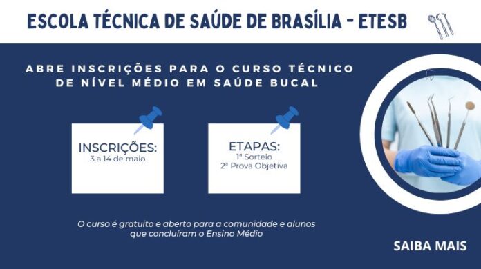 A Escola Técnica de Saúde Bucal de Brasília (Etesb) realizará processo seletivo para provimento de 40 vagas no curso de Educação Profissional de Nível Médio, técnico em saúde bucal. O curso tem duração de 18 meses, com carga horária de 1.600 horas e aulas de segunda a sexta-feira, no período matutino.