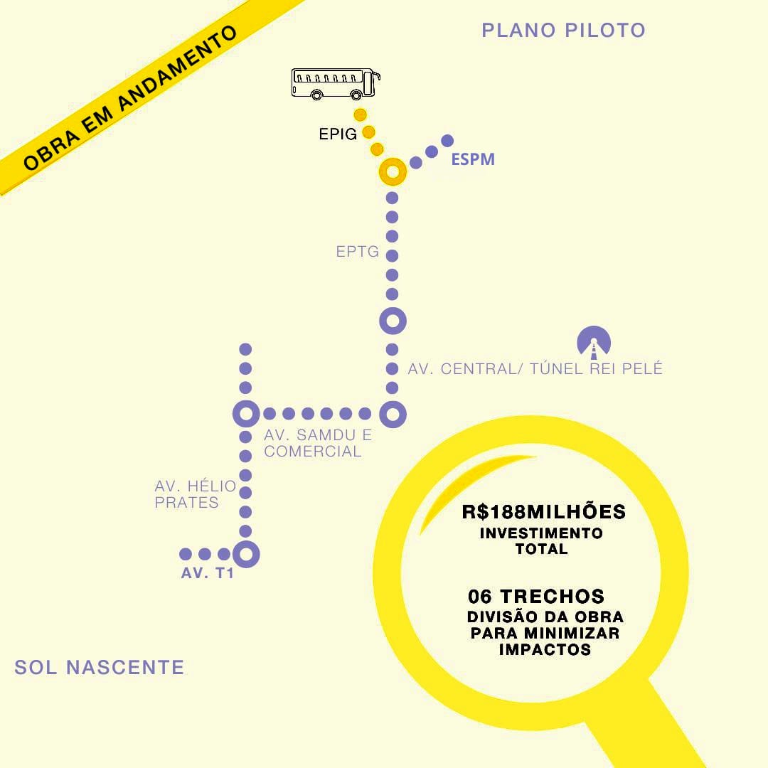 Por questões de segurança e logística, os trabalhos serão divididos em seis trechos. No momento, a obra mais avançada em andamento na via é a construção do viaduto na interseção da Epig com o Sudoeste e o Parque da Cidade. Uma média de 25 mil veículos passam pelo local diariamente.