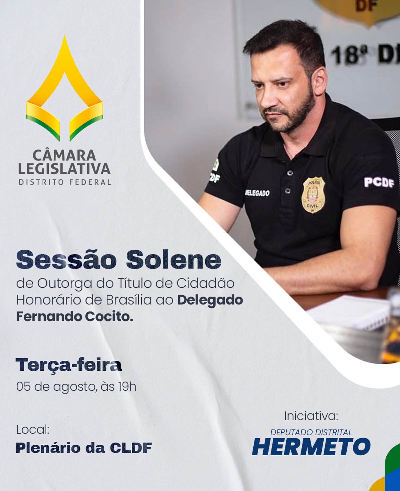 O delegado Fernando Cocito, um dos nomes mais reconhecidos da Polícia Civil do Distrito Federal, será homenageado com o título de Cidadão Honorário de Brasília em sessão solene marcada para esta terça-feira, 5 de agosto, às 19h, no plenário da Câmara Legislativa do Distrito Federal (CLDF). A proposta da homenagem é de autoria do deputado distrital Hermeto (MDB), que ressalta a importância de reconhecer personalidades que contribuem de maneira significativa para a segurança e o bem-estar da população do DF.