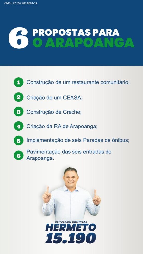 “Esta é uma proposta minha de campanha, transformar o Arapoanga em Região Administrativa. Além disso também vamos construir um restaurante comunitário lá, em uma área que já foi escolhida”, afirma Hermeto.