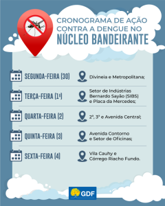 O secretário de Governo, José Humberto Pires de Araújo, destaca que a ação busca evitar que, com o retorno das precipitações, o DF volte a sofrer com os casos de dengue. “O GDF está trabalhando de forma integrada com o objetivo de que o enfrentamento ao Aedes aegypti seja mais ostensivo e efetivo neste ano”, enfatiza o secretário.