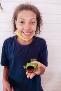 Quem participou da oficina de reciclagem e gostou do resultado foi Rafaela Fernandes, de 12 anos. “Eu fiz um sapinho com rolo de papel higiênico. Achei interessante, nunca tinha pensado em fazer isso. A professora deu várias opções, muita gente preferiu fazer um binóculo ou uma cobra”, conta.