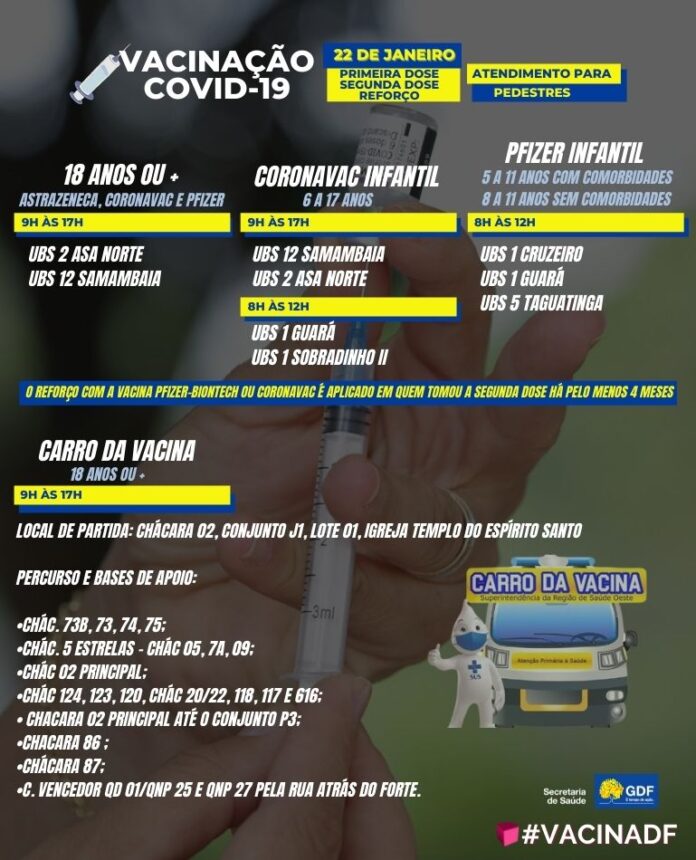 Neste sábado (22), o Distrito Federal começa a vacinar crianças de 6 e 7 anos contra a covid-19. Elas receberão a primeira dose da vacina CoronaVac, cuja aplicação para o público infantil foi autorizada pela Anvisa e incluída no Programa Nacional de Imunização pelo Ministério da Saúde na noite desta sexta-feira (21). A vacinação ocorrerá até às 17h em pontos específicos.