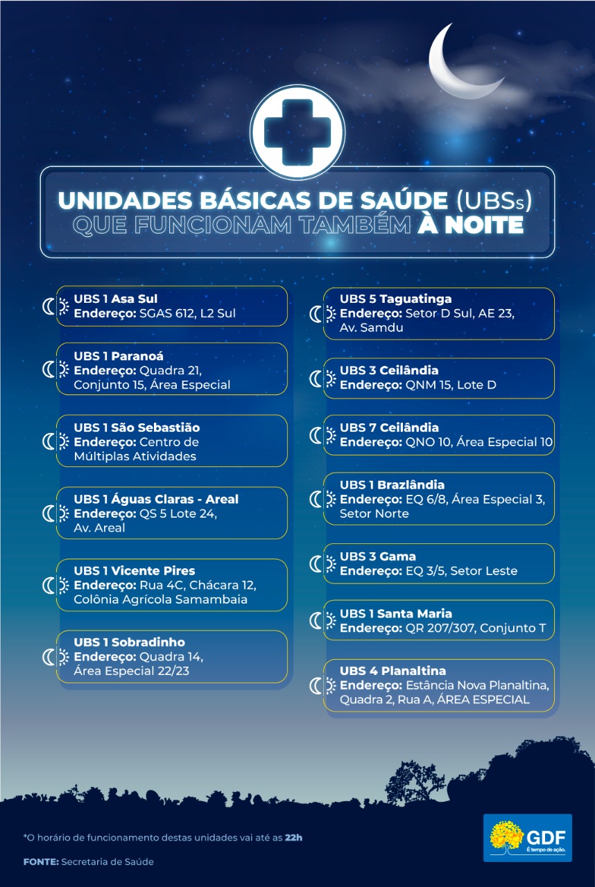 O Distrito Federal conta atualmente com 13 unidades básicas de saúde (UBSs) que funcionam até as 22h. Uma longa jornada de atendimento – visto que abrem às 7h da manhã – e que oferece maior conforto e alternativas à população. Uma opção para aquela mãe que, por exemplo, precisa levar o filho febril para ser examinado. Ou um paciente que necessita de uma troca de curativos. Situações em que, muitas vezes, o horário possível para buscar atendimento é o noturno.
