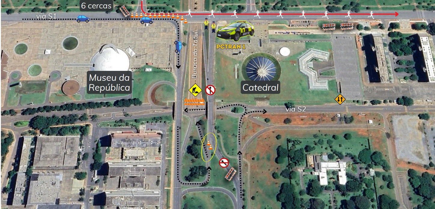 Às 18h30, as equipes do Detran-DF vão interditar cinco faixas da via S1, a partir do Museu da República, e o fluxo de veículos será desviado para a L2 Sul. Na Esplanada, a faixa mais à direita será destinada à saída de veículos vindos dos Ministérios. O fluxo seguirá até na altura do Itamaraty, onde será desviado para a via S2. O acesso ao estacionamento da Catedral será permitido apenas pelo túnel da Cúria, na via S2.