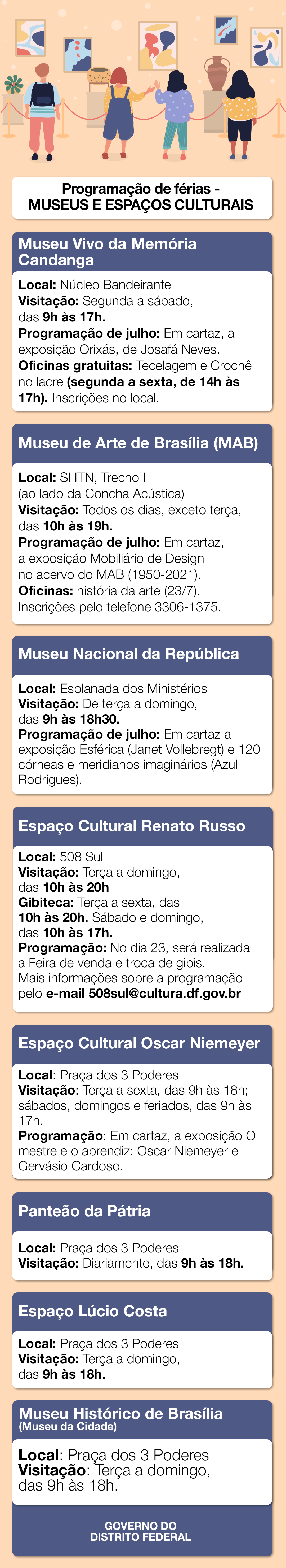 Além de representar o esperado recesso escolar da criançada, o mês de julho é escolhido também pelos brasilienses para um bom passeio e viagens Brasil afora. Visitar museus e espaços culturais é uma boa pedida para quebrar a rotina, independentemente da idade. Uma verdadeira viagem cultural. Veja, ao final, a programação e os horários de alguns desses espaços abertos no mês de férias.