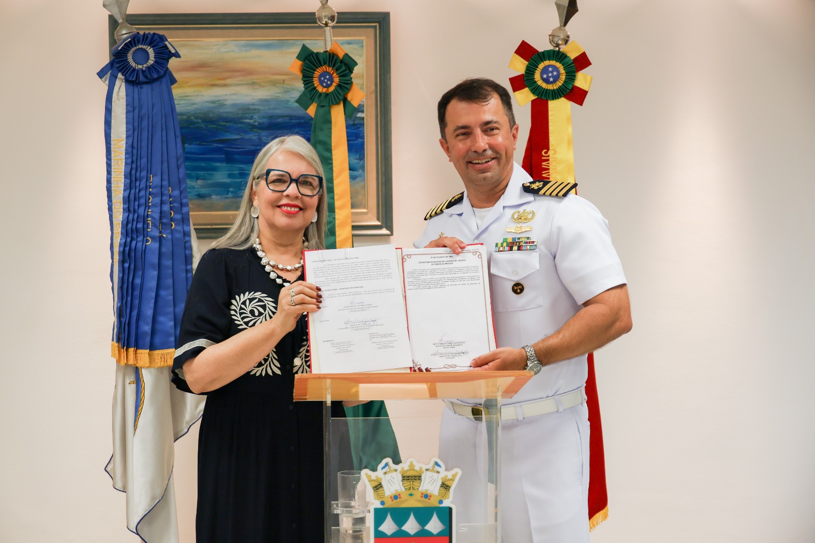 A secretária Hélvia Paranaguá e comandante Braga assinam o acordo do programa Forças no Esporte (ProFest)
