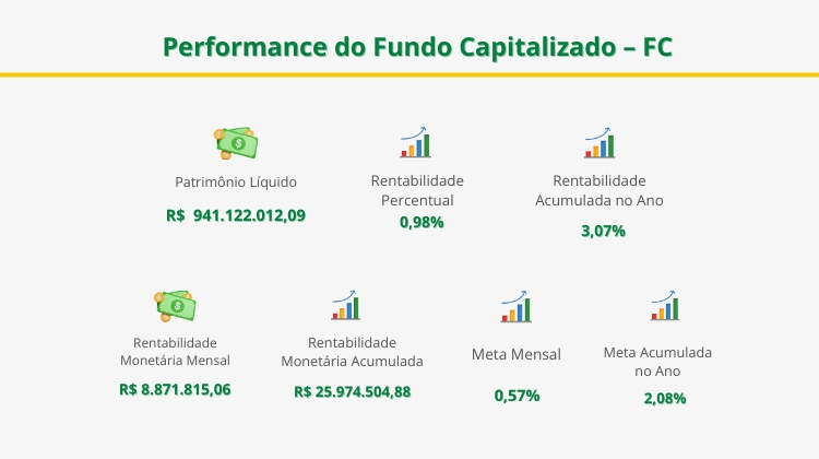 Já o Fundo Capitalizado (FC) obteve R$ 25,9 milhões de rentabilidade acumulada no primeiro trimestre, o que representa 3,07% no período, enquanto a meta estabelecida foi de 2,08%. Com um patrimônio atual de R$ 941 milhões, este fundo tem como característica o aporte de contribuições dos servidores que ingressaram no serviço público do Distrito Federal a partir de março de 2019, sendo responsável pelo pagamento de benefícios previdenciários até o limite do teto do INSS.