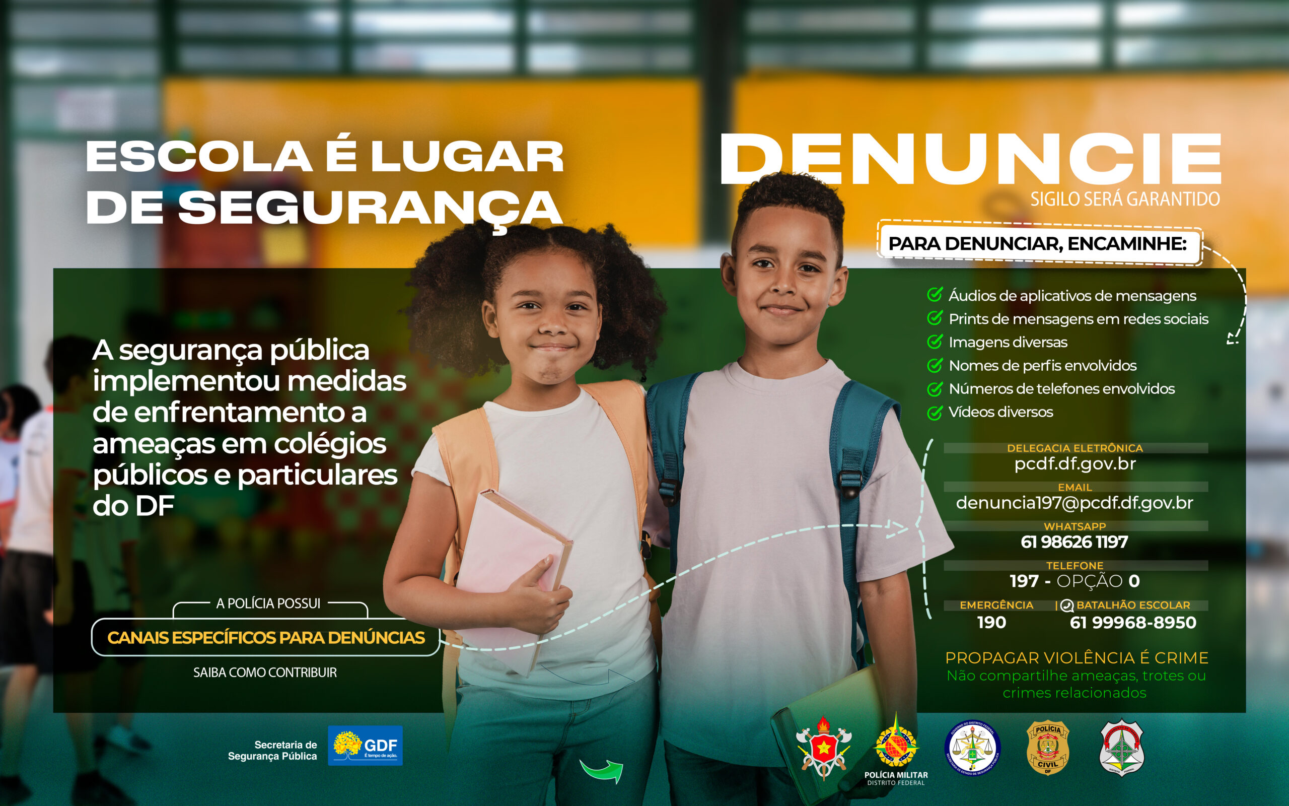 Avelar divulgou material onde constam canais específicos de denúncias (veja abaixo), com sigilo garantido, que podem ser usados pela população para encaminhar dados de aplicativos de mensagens e perfis de redes sociais que contenham alguma ameaça. E pediu a participação da comunidade, assim como um esforço dos pais. “Sugerimos aos pais que olhem a mochila de seus filhos, vistoriem os celulares. Temos encontrado armas brancas levadas por estudantes aos colégios. O trabalho é conjunto, no sentido de transmitir paz e segurança para todos”, frisou.