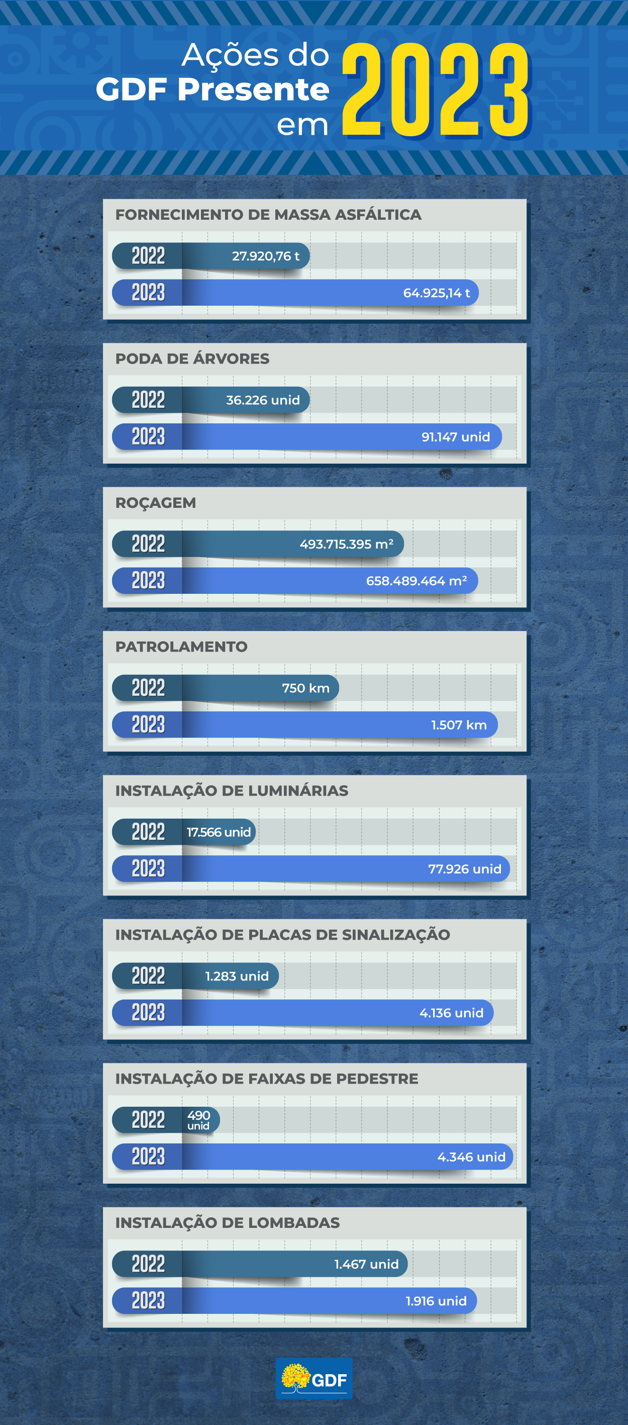 Junto à CEB, o GDF Presente quadruplicou a instalação de luminárias das cidades – foram 77.926 unidades em 2023, ante 17.566 em 2022. Além disso, houve a substituição de 227 postes. Com o Detran-DF, as ações proporcionaram maior trafegabilidade à população. Foram instaladas 4.136 placas de sinalização, pintadas 4.346 faixas de pedestre e criadas 1.916 lombadas.