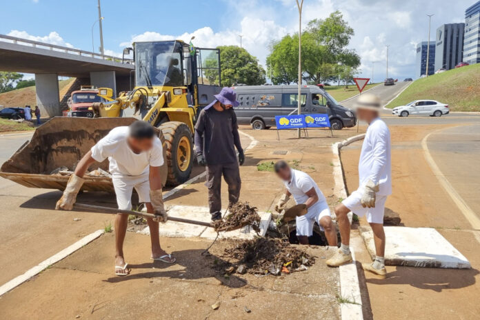 Equipe do GDF Presente com 18 homens, seis deles reeducandos da Secretaria de Administração Penitenciária (Seape), trabalha na limpeza das bocas de lobo | Foto: GDF Presente