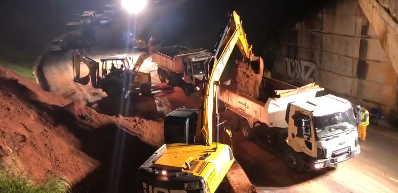 Após 12 horas ininterruptas de serviço executado pelas equipes do órgão, a trinca verificada no talude, que é a parede de contenção próxima ao viaduto, foi solucionada, tendo sido o tráfego de veículos liberado a seguir. Nesta quarta-feira será realizada uma nova vistoria.
