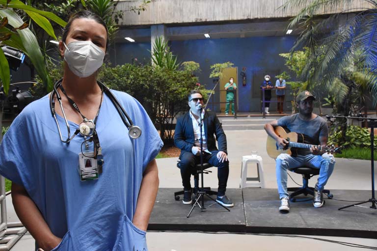 Durante o evento, o cantor Wagner Max, 39 anos, fez uma apresentação. Ele contou que, em maio e em junho do ano passado, os irmãos ficaram internados no Hran, vítimas da covid-19. Desde que tiveram alta, ele faz apresentações gratuitas no hospital para agradecer pelo tratamento que eles receberam. “Tenho um sentimento de gratidão muito forte pela equipe que cuidou da minha família, assim retribuo com o meu trabalho.”