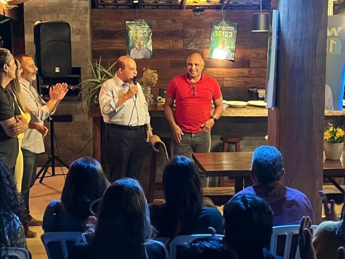 O chefe do Executivo foi recebido pelo anfitrião Anis Nacfur, pelo diretor-geral do DER/DF, Fauzi Nacfur Júnior, e pelo candidato a deputado distrital Wellington Luiz em um condomínio no Jardim Botânico.