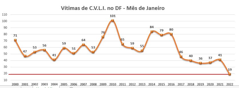 Foram registrados 10 homicídios por grupo de 100 mil habitantes, índice mais baixo desde 1977, que teve 14 homicídios por grupo de 100 mil habitantes. No primeiro mês deste ano, a tendência de queda se manteve. No comparativo com o mesmo mês do ano passado, houve redução de 56,4% no número de vítimas desse crime em todo o DF, o menor em 23 anos para o mês.