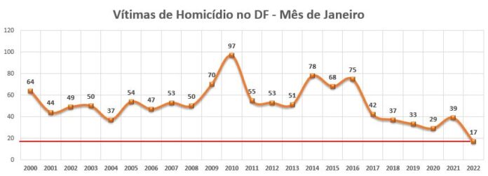 Foram registrados 10 homicídios por grupo de 100 mil habitantes, índice mais baixo desde 1977, que teve 14 homicídios por grupo de 100 mil habitantes. No primeiro mês deste ano, a tendência de queda se manteve. No comparativo com o mesmo mês do ano passado, houve redução de 56,4% no número de vítimas desse crime em todo o DF, o menor em 23 anos para o mês.