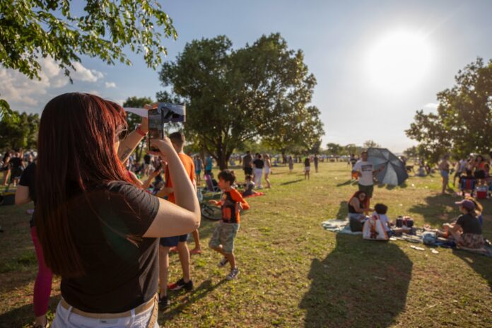 Nem os 30 ºC de Brasília na tarde deste sábado (14) espantaram os brasilienses da Praça do Cruzeiro, no Eixo Monumental. Abrigados embaixo dos guarda-sóis e das sombras das árvores, mais de três mil pessoas observavam o eclipse solar, que teve o seu ápice às 16h45, momento em que a Lua se alinhou entre o Sol e a Terra.