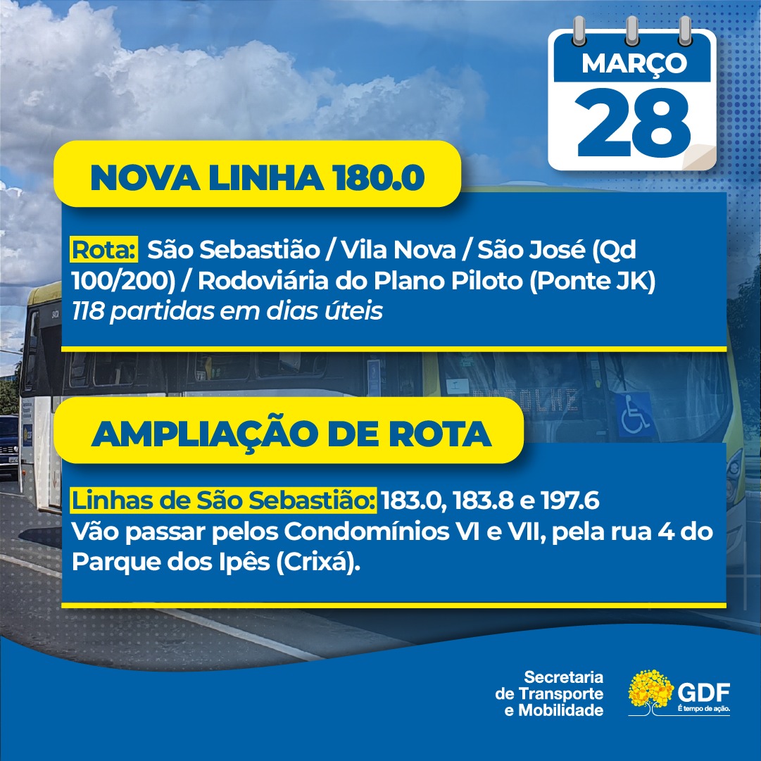A Secretaria de Transporte e Mobilidade (Semob) disponibilizará uma nova linha de ônibus para atender os moradores de São Sebastião que querem se deslocar para Rodoviária do Plano Piloto. A linha 180.0 começará a operar nesta segunda-feira (28), partindo do terminal rodoviário de São Sebastião, passando pela Ponte JK e seguindo até a área central de Brasília.