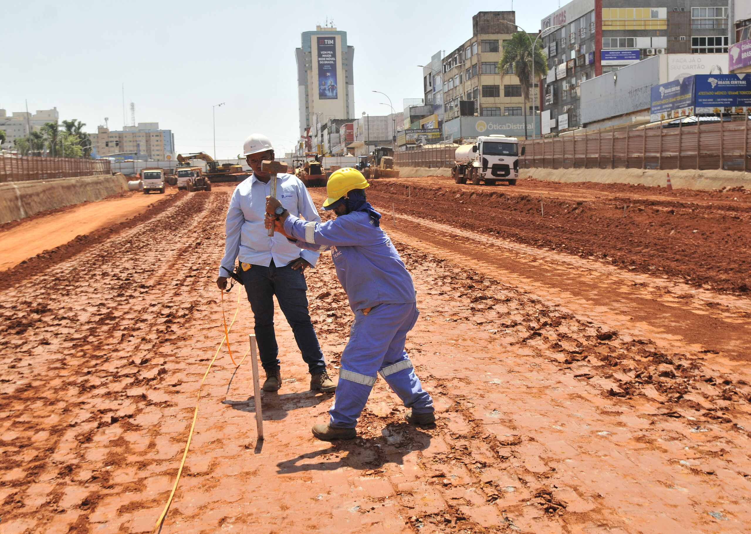 O caminhão pipa entra em ação na fase de tratamento do solo. Aguiar explica que fazer um aterro é como seguir uma receita de bolo. “Se o solo está muito seco, é preciso molhar. Se está muito úmido, é preciso ‘abrir’ a terra para que ela possa secar”, comenta o engenheiro. “Testamos em laboratório o ponto de umidade ideal para que o solo seja compactado com perfeição. E reproduzimos essa condição no local da obra”, informa.