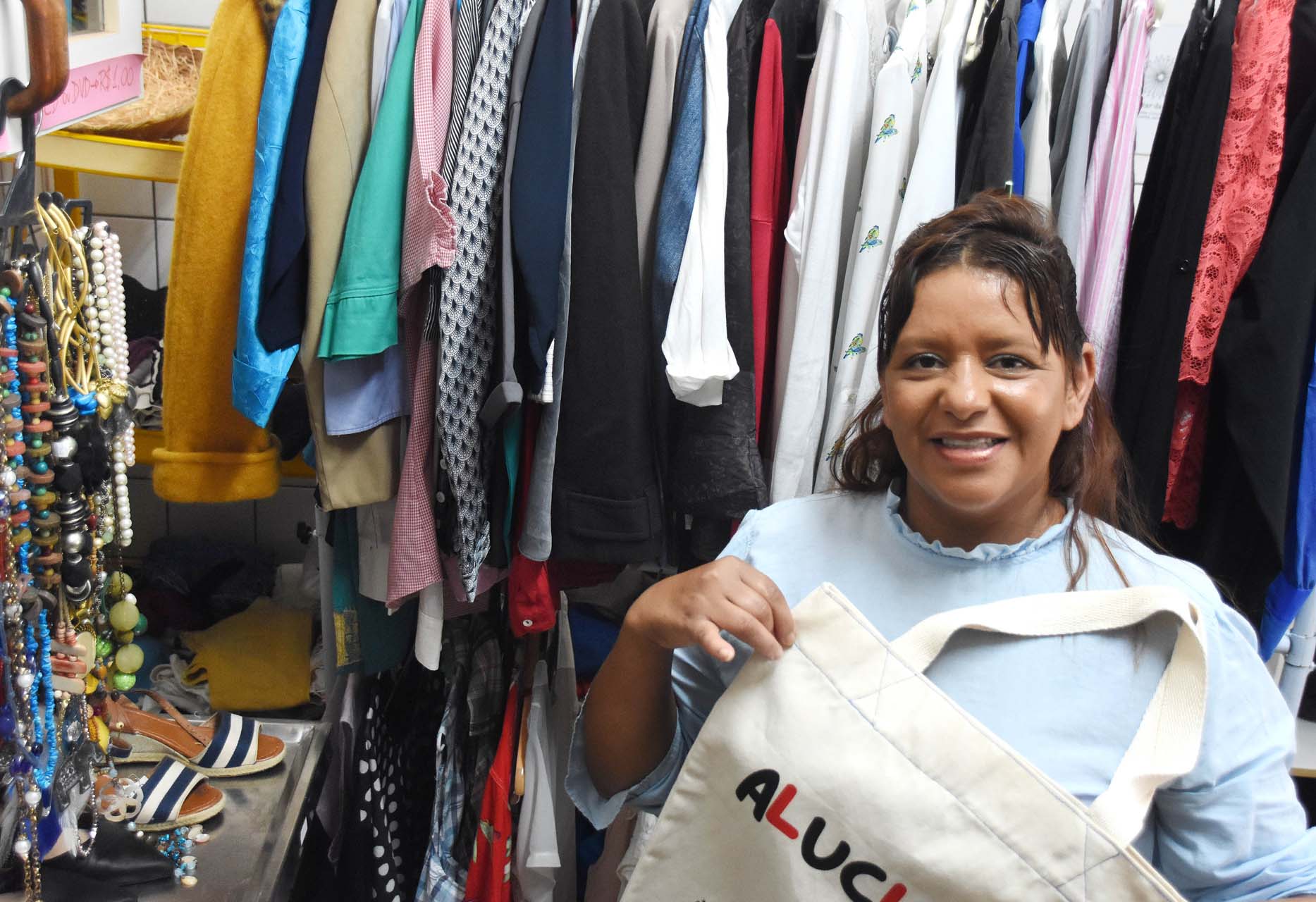 Saias, calças, vestidos, sapatos, acessórios estão expostos em araras dentro do Caps do Paranoá. As peças compõem o cenário das 8h às 16h, de segunda a sexta. Entre as roupas, Rejane Ramos, 48, apresenta o mostruário e garimpa os estilos. “Eu sei, só de olhar a pessoa, qual é a numeração que veste”, vangloria-se.