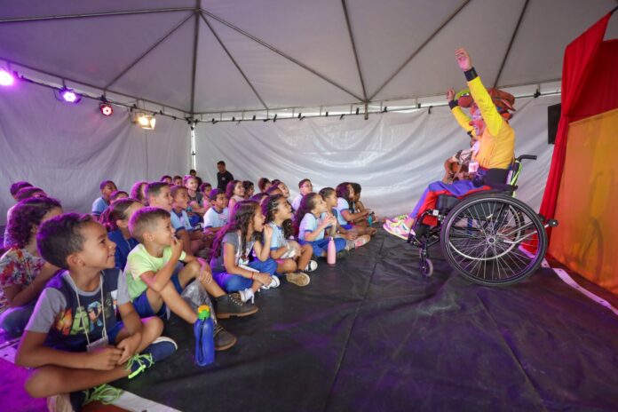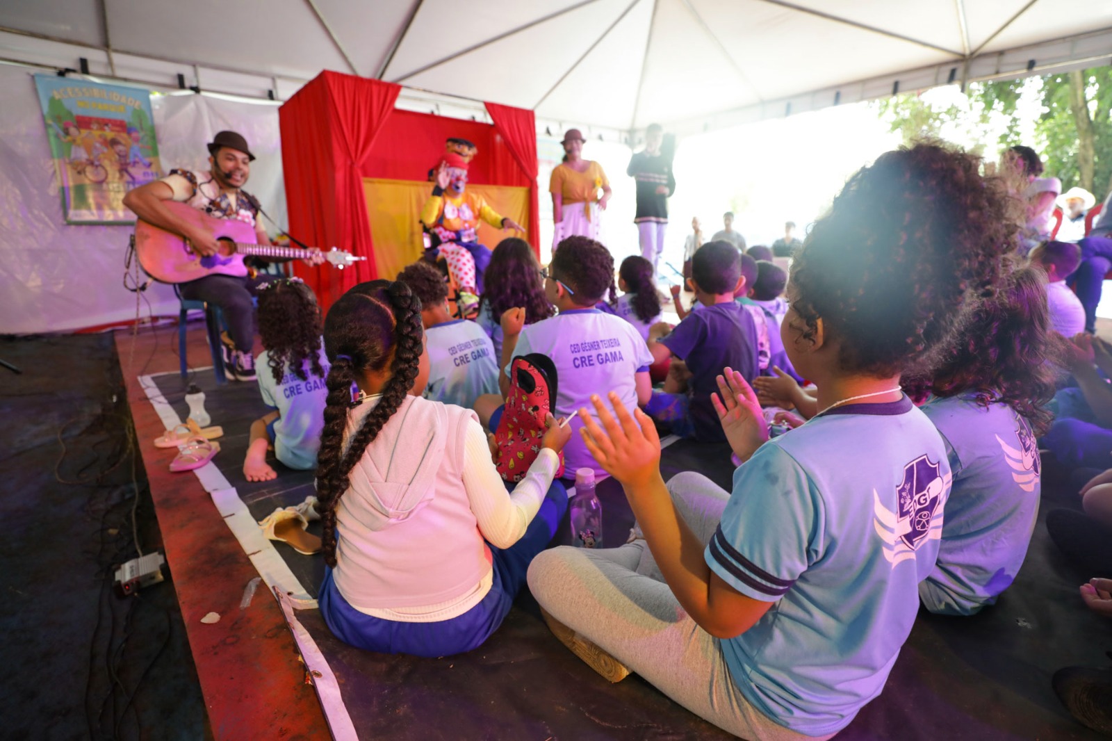 Nesta quinta-feira (14), pela manhã, foi a vez da turma do 1º e 2º ano de alunos da Escola Classe Gesner Teixeira, do Gama. O projeto oferece ônibus para levar estudantes gratuitamente para um passeio cultural no local onde serão realizadas as apresentações. As crianças cantaram, brincaram e interagiram com os artistas.