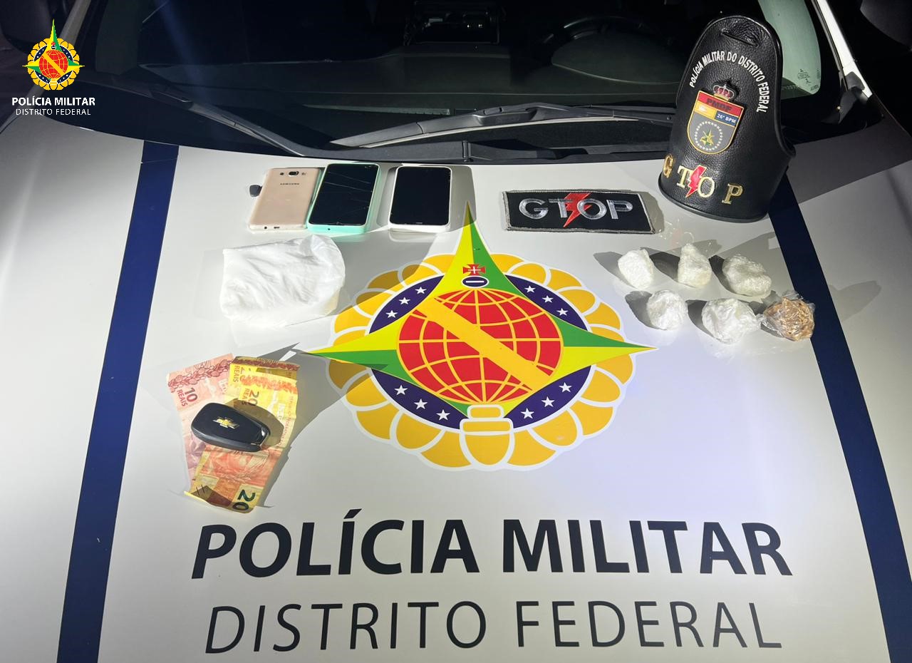 A equipe policial decidiu abordar o veículo com três ocupantes, duas mulheres e um homem, quando um passageiro se abaixou no momento que viu os policiais. Foi realizado um breve acompanhamento pela DF 483 até a abordagem do veículo.