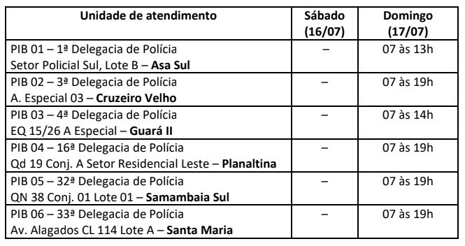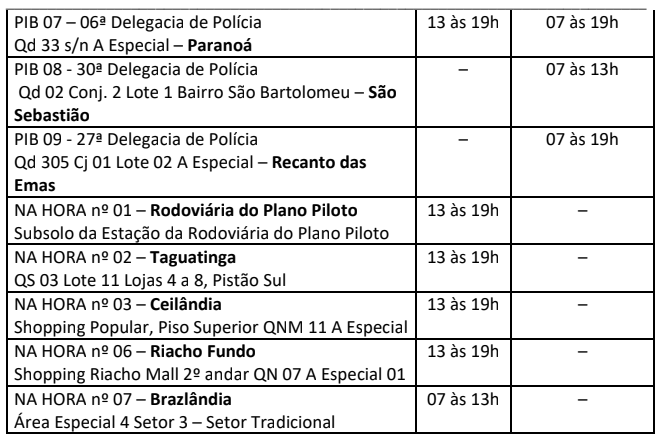 Os atendimentos poderão ser agendados nesta sexta-feira (15), a partir das 12h, no site da PCDF ou por meio do telefone 156, no mesmo horário. Os atendimentos serão realizados nas unidades do Instituto de Identificação, conforme relação abaixo. O cidadão deverá selecionar a unidade de preferência no momento do agendamento.
