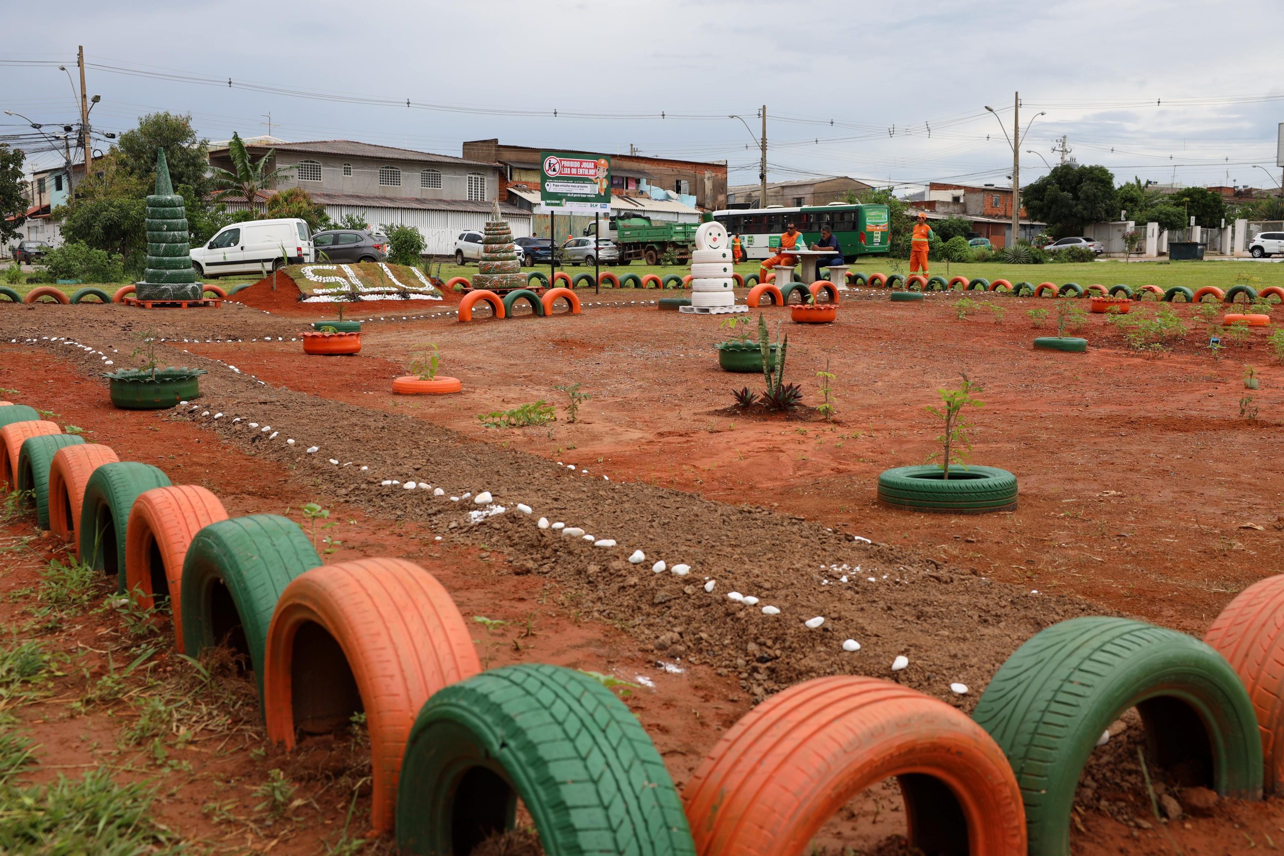 O Projeto De Cara Nova, do SLU, renova locais de descarte irregular de lixo, por meio do plantio de mudas e do uso de pneus coloridos, além da instalação de sinalizações educativas, com placas orientando sobre as penalidades e o local correto de descarte | Foto: Divulgação/SLU