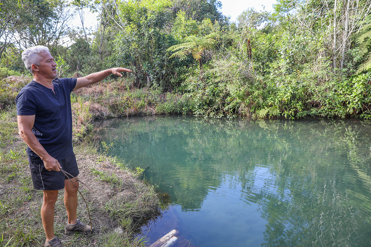 O produtor rural Joceilson Alves de Souza, 53 anos, foi um dos primeiros a aderir o projeto de conservação da água e do solo. Na época, ele estava criando uma agrofloresta na propriedade e encontrou na iniciativa o apoio técnico necessário. “O objetivo é proteger a terra para que a água da chuva seja retida no lençol freático, como uma esponja. Uma prova de que está dando certo é que este ano, pela segunda vez consecutiva, surgiu uma nascente, mostrando que tem água aqui embaixo”, conta.