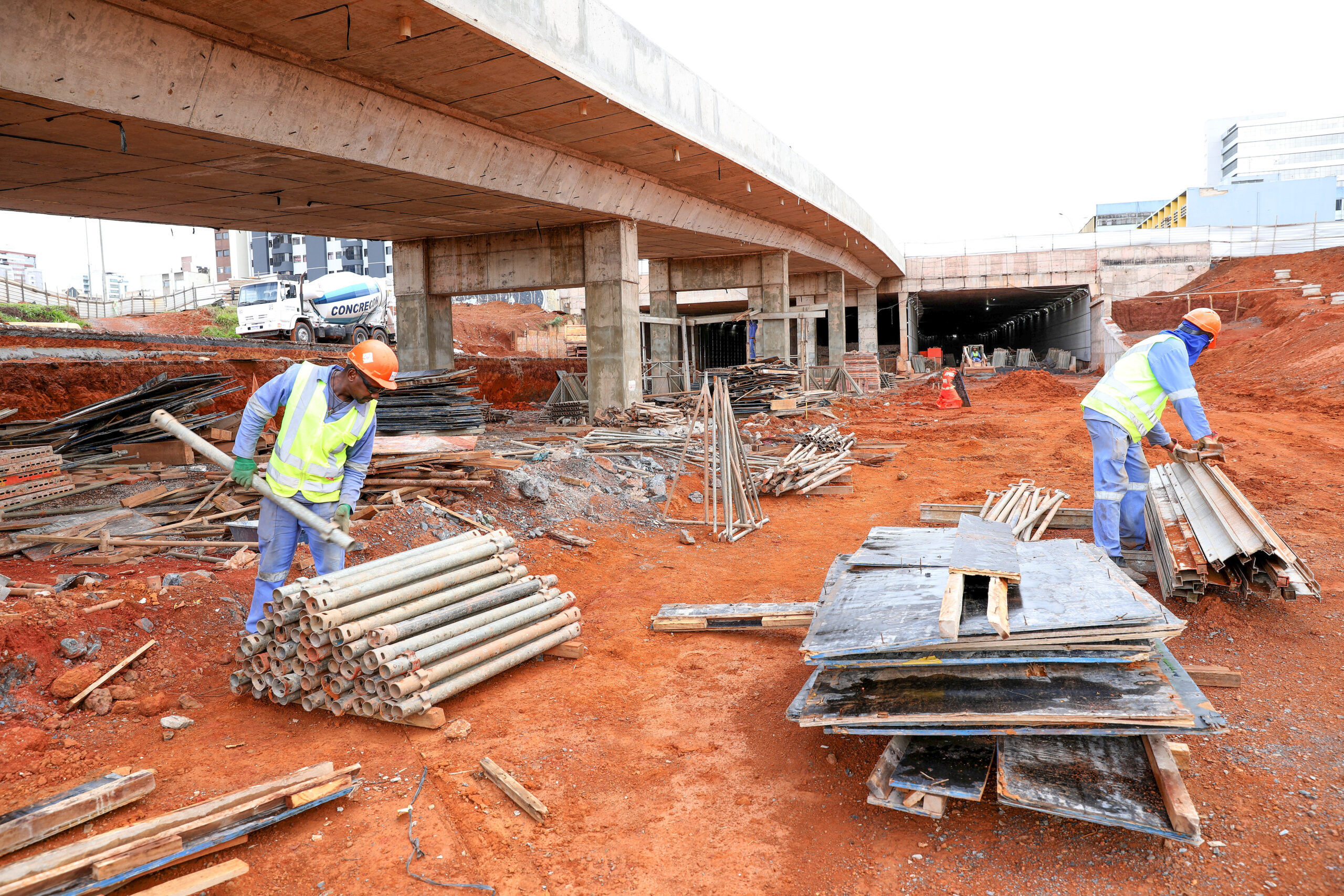 O viaduto exclusivo para ônibus que ligará a Avenida Samdu ao Túnel de Taguatinga já está livre do seu escoramento provisório. Os 620 tubos metálicos que apoiaram a pista por um mês inteiro começaram a ser retirados no dia 4 deste mês. Foram cerca de 15 dias de trabalho até que o vão pudesse ser visto sem o cimbramento.