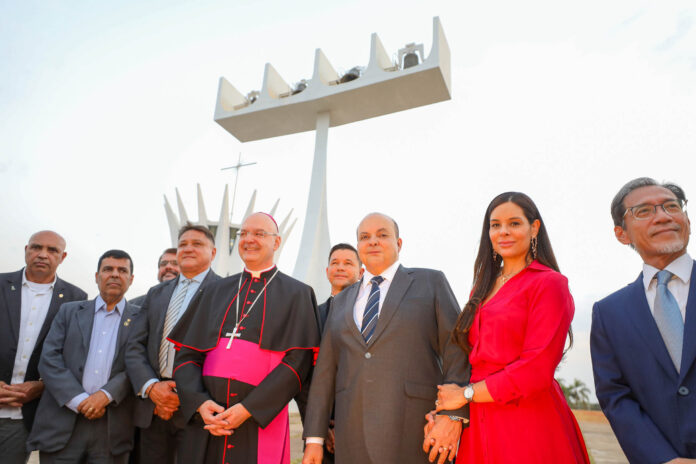 A reinauguração do símbolo ocorreu com uma cerimônia em frente ao campanário com a presença do governador Ibaneis Rocha, da primeira-dama do DF Mayara Noronha Rocha e de outras autoridades locais | Fotos: Joel Rodrigues/Agência Brasília