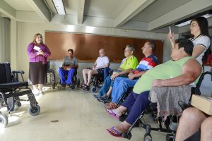 Beneficiários de programa de cadeiras de rodas recebem instruções sobre a operação do equipamento