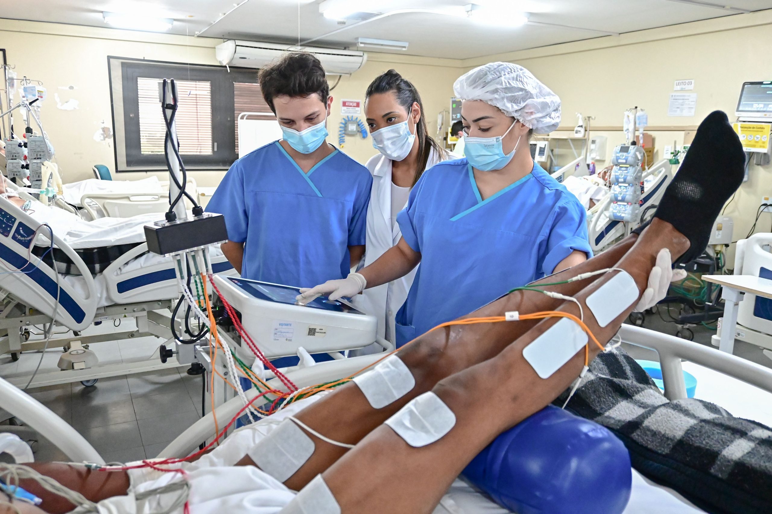 A UTI Neurotrauma do Hospital de Base do Distrito Federal (HBDF) recebeu a visita de pesquisadores de um hospital privado de São Paulo em busca de aprender mais sobre a Neuromodulação por Estimulação Elétrica Periférica (Neep) e sobre como implementar o Time de Suporte Neuromuscular Avançado.
