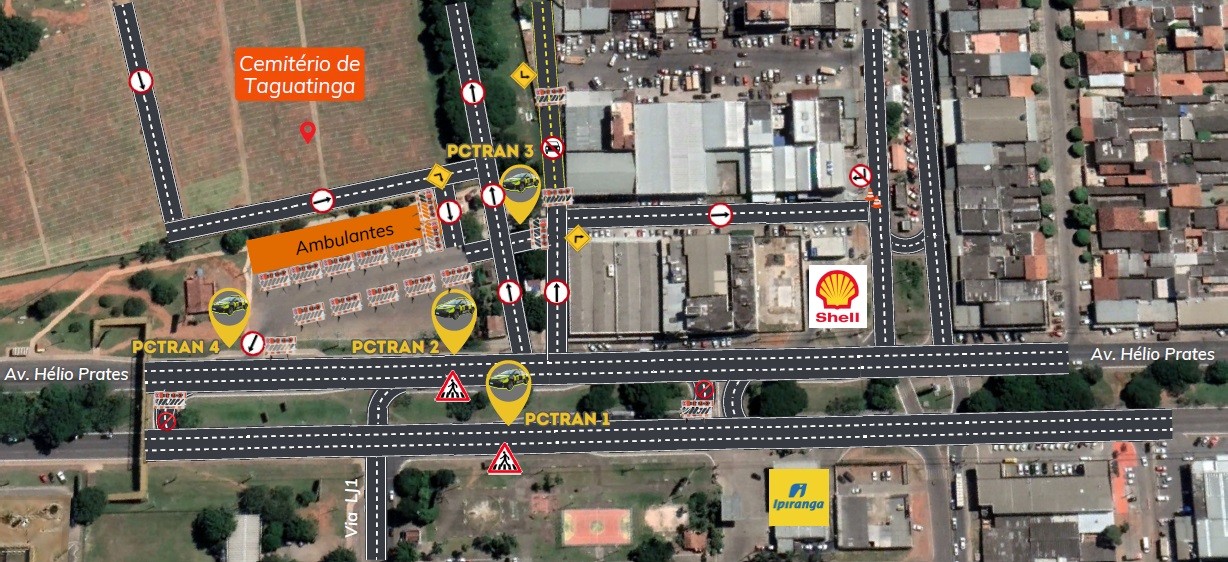 Em Taguatinga Norte, na via Hélio Prates, nas proximidades do cemitério, as equipes do Detran-DF darão início à implantação da sinalização temporária na sexta-feira (31), às 23h59. No domingo, o estacionamento em frente ao cemitério será utilizado como área de embarque e desembarque. Além disso, parte do espaço será destinado a vendedores ambulantes.