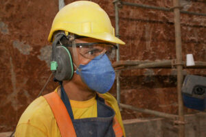“Aí eu coloco o protetor auricular, porque o martelete faz bastante barulho. Em seguida, vem o capacete e os óculos, que me protegem de qualquer pedacinho de concreto que voe na minha direção”, conta Marinaldo. Depois de subir no andaime, é hora de prender o cinto de segurança na estrutura metálica. “O último item que visto é a luva gorila”, diz.