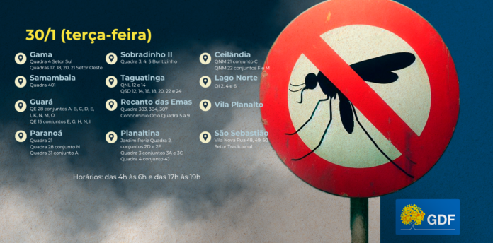 Mais 12 regiões administrativas recebem ação preventiva em dois horários: das 4h às 6h e das 17h às 19h. Recomendação é que as pessoas abram portas e janelas quando passar o veículo de aplicação do inseticida de ultrabaixo volume (UBV)
