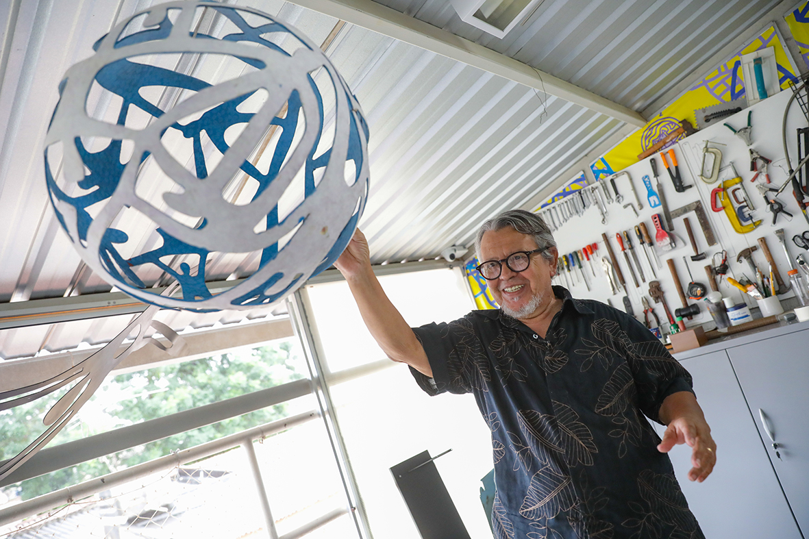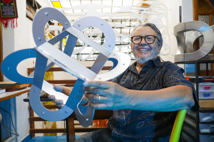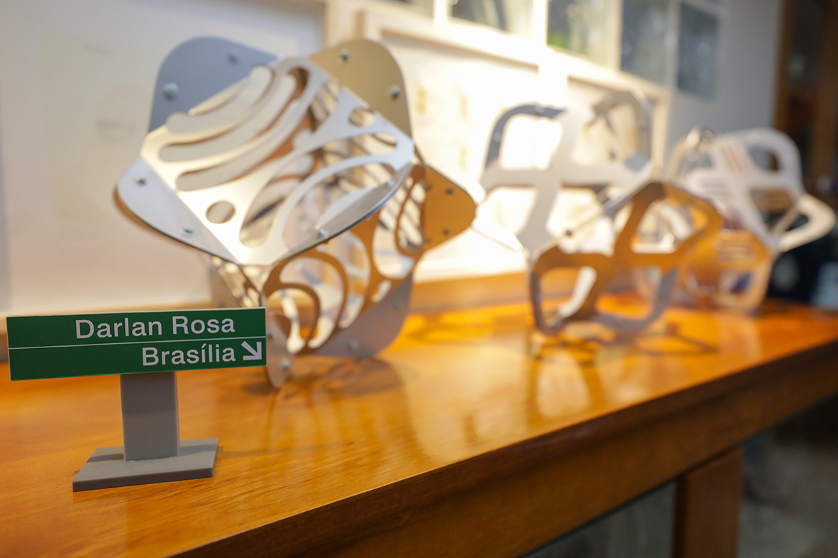 Quando tinha 20 anos, o escultor Darlan Rosa, 77 anos, veio do interior de Minas Gerais para Brasília. A mudança para a nova capital transformou a identidade das obras do artista plástico, que passou a fazer esculturas em aço inox, parafusadas e vazadas de forma a se conectarem harmonicamente com a cidade. “Se você observar as minhas esculturas, elas partem da geometria da cidade. Minha arte nasceu da interação com Brasília. Tudo que tenho feito e faço parte da ideia da cidade”, explica.