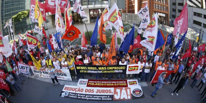 Centrais sindicais fizeram, nesta terça-feira (18), um ato pedindo a queda da taxa básica de juros (Selic), na Avenida Paulista, região central da capital. Com bandeiras e carros de som, o grupo se reuniu em frente ao prédio do Banco Central (BC). O presidente da autoridade monetária, Campos Neto, também foi criticado durante o protesto.