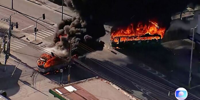 Criminosos atearam fogo em 35 ônibus e até na cabine de um trem da Supervia entre a tarde e a noite de segunda-feira, após uma operação policial ter resultado na morte de uma das lideranças da milícia que atua na zona oeste do Rio.