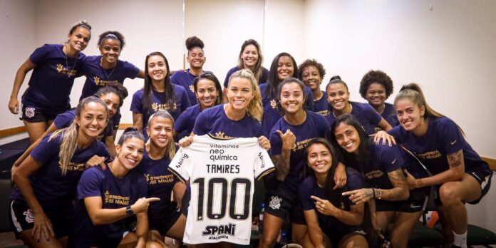 Foi a centésima partida de Tamires pelo Alvinegro. A lateral de 34 anos, que atua como meia esquerda no time das Brabas, foi a campo usando uma camisa com o número 100 às costas.