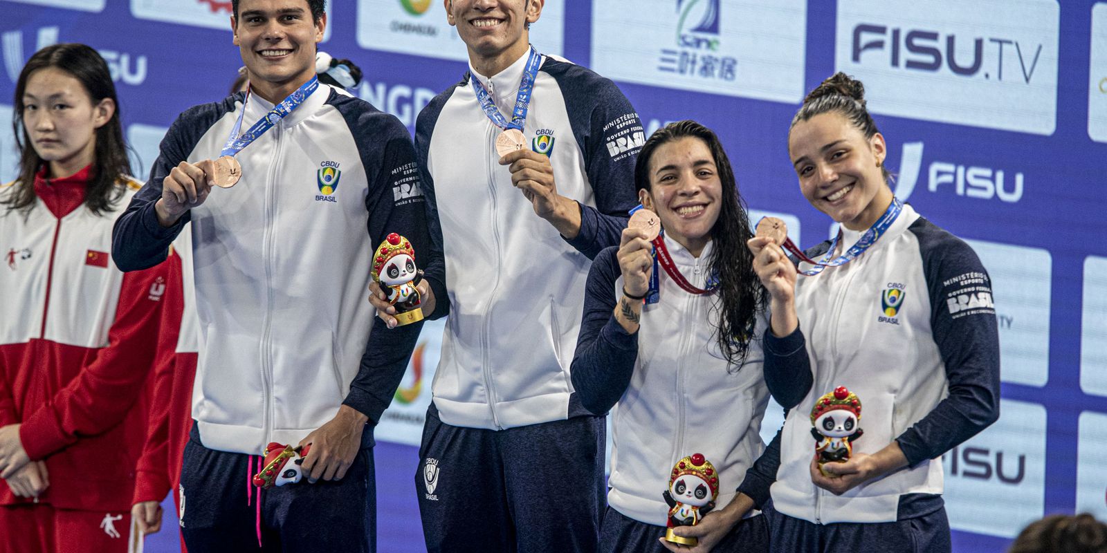 Assim que chegaram à Vila dos Atletas, já partiram para a piscina para realizarem o primeiro treino. Foi desta forma, unido, que o Brasil conquistou a medalha de bronze no revezamento 4×100 metros estilo livre misto no Dong’an Lake Sports Park Aquatics Centre. A China levou o ouro e a Itália conquistou a medalha de prata. O quarteto brasileiro entrou na piscina com Luanna Nunes, Fernanda Celidônio, Vinicius Assunção e Breno Correia.